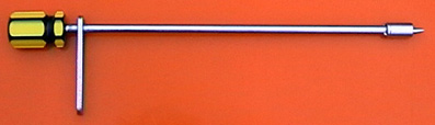 The screwdriver can be turned while you hold the nut steady and vice versa  End view shows the 8mm socket with the screwdriver head  The 11" long screwdriver slips out of the nut adjusting shaft | The Carbtool is for older bikes that have an adjuster screw held by a locknut. The Carbtool has an 8mm socket to tighten the locknut. Down the centre of the tool runs a long screwdriver to hold the adjusting screw stready while you tighten the nut. The screwdriver has a 280mm (11") shaft. Most modern bikes don't use this as the adjusting screws are spring loaded. Check your bike before ordering. Only £12. |